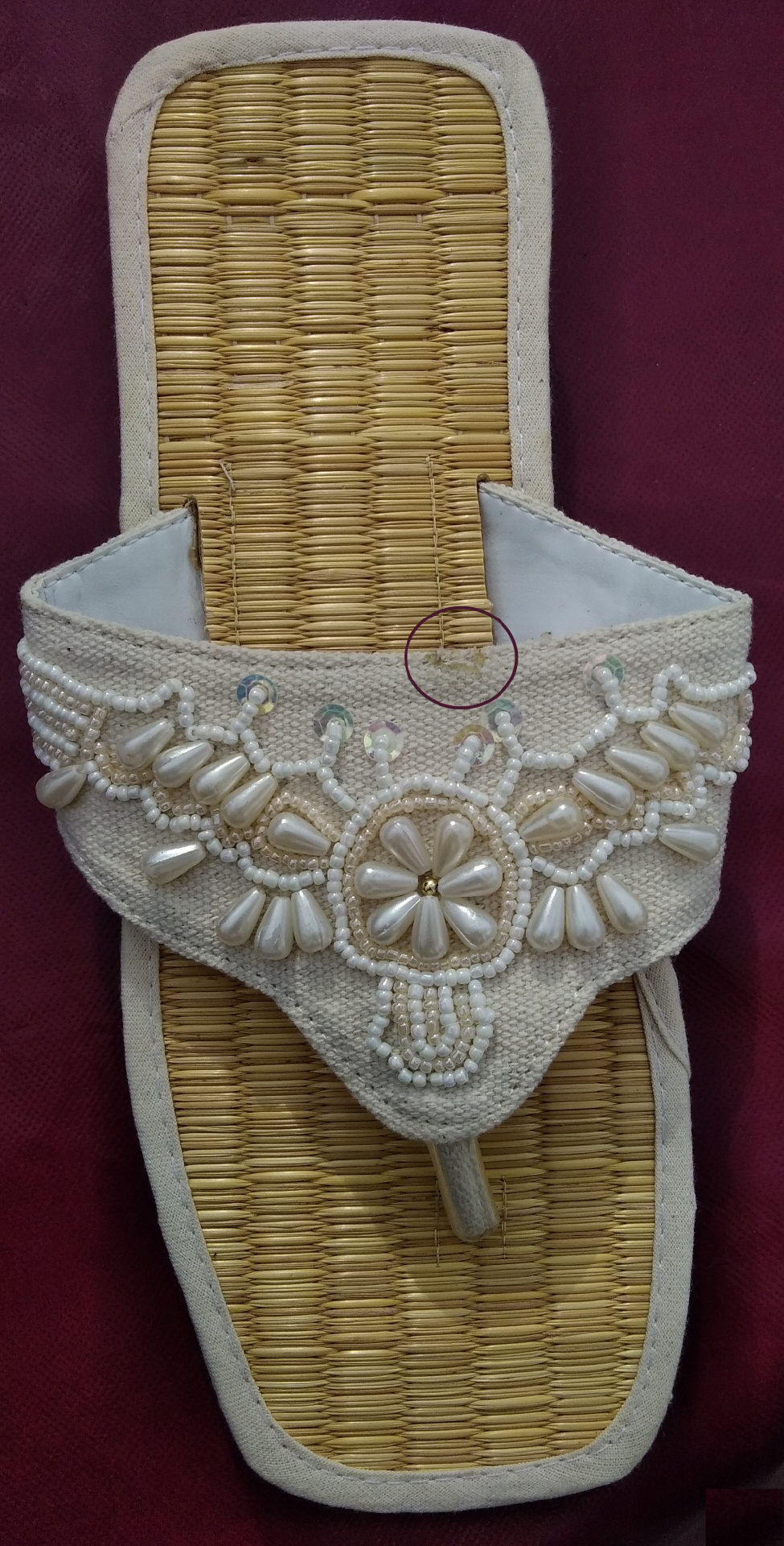 Der Baumwollriemen des rechten Schuhs ist an einer Stelle mit etwas Kleber verschmutzt, wie auf dem Foto markiert.