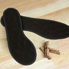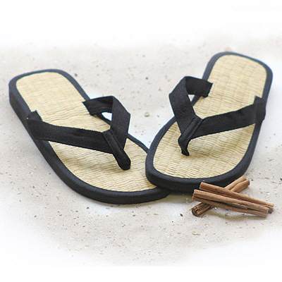 Das Fußbett der Zimtlatschen ist größtenteils aus geflochtenen Binsenhalmen, aufgebracht auf eine schwarze Laufsohle aus EVA. Das Fußbett ist gefüllt mit natürlichem Zimtpulver und sorgt für angenehmen Tragekomfort. Die Halteriemen bestehen aus weicher Baumwolle.